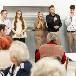 „Dnes sme tu preto, aby sme vám vyjadrili úctu, uznanie a vďaku a aby sme vás pri tejto príležitosti potešili malým kultúrnym programom a darčekom. Prajem vám, aby sme sa ešte mnohokrát mohli takto spoločne stretnúť,“